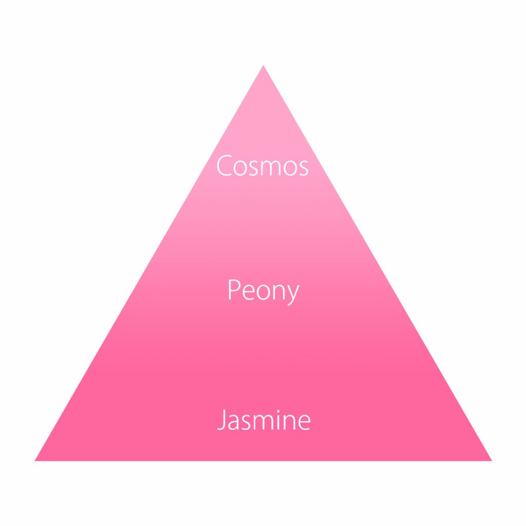 乙女の純真という花にこめられたメッセージにぴったりな薄く柔らかな花びらを広げ心地よい風にふんわりと揺れるピンク色のコスモスのイメージ。繊細なコスモスの香りに、ピオ二ーやジャスミンの華やかな香りのブーケが合わさった乙女の香り。