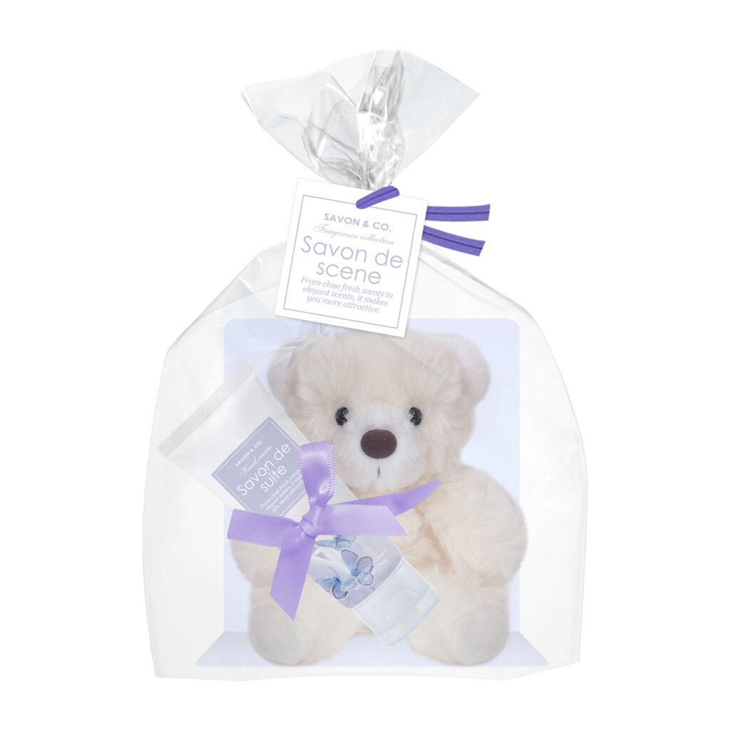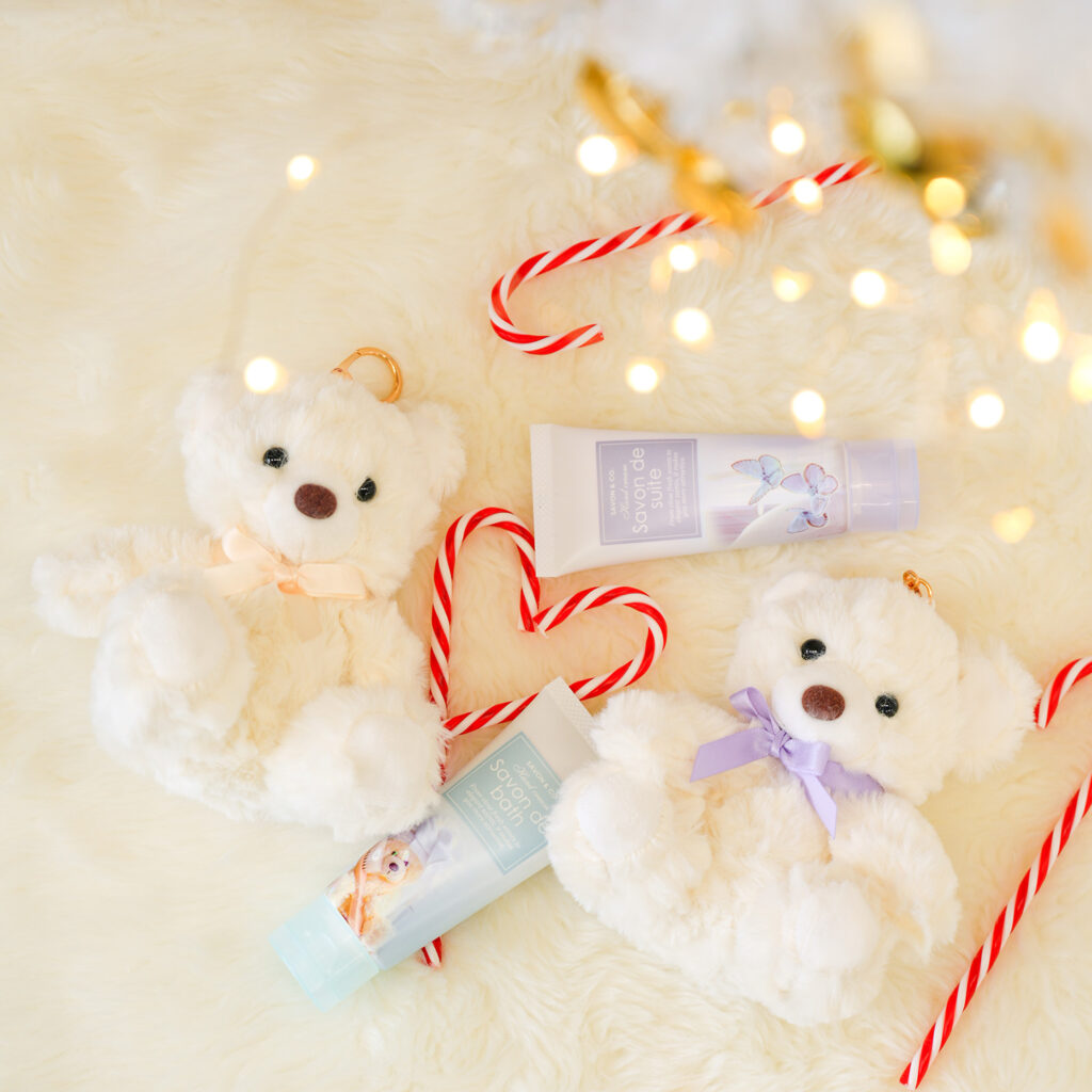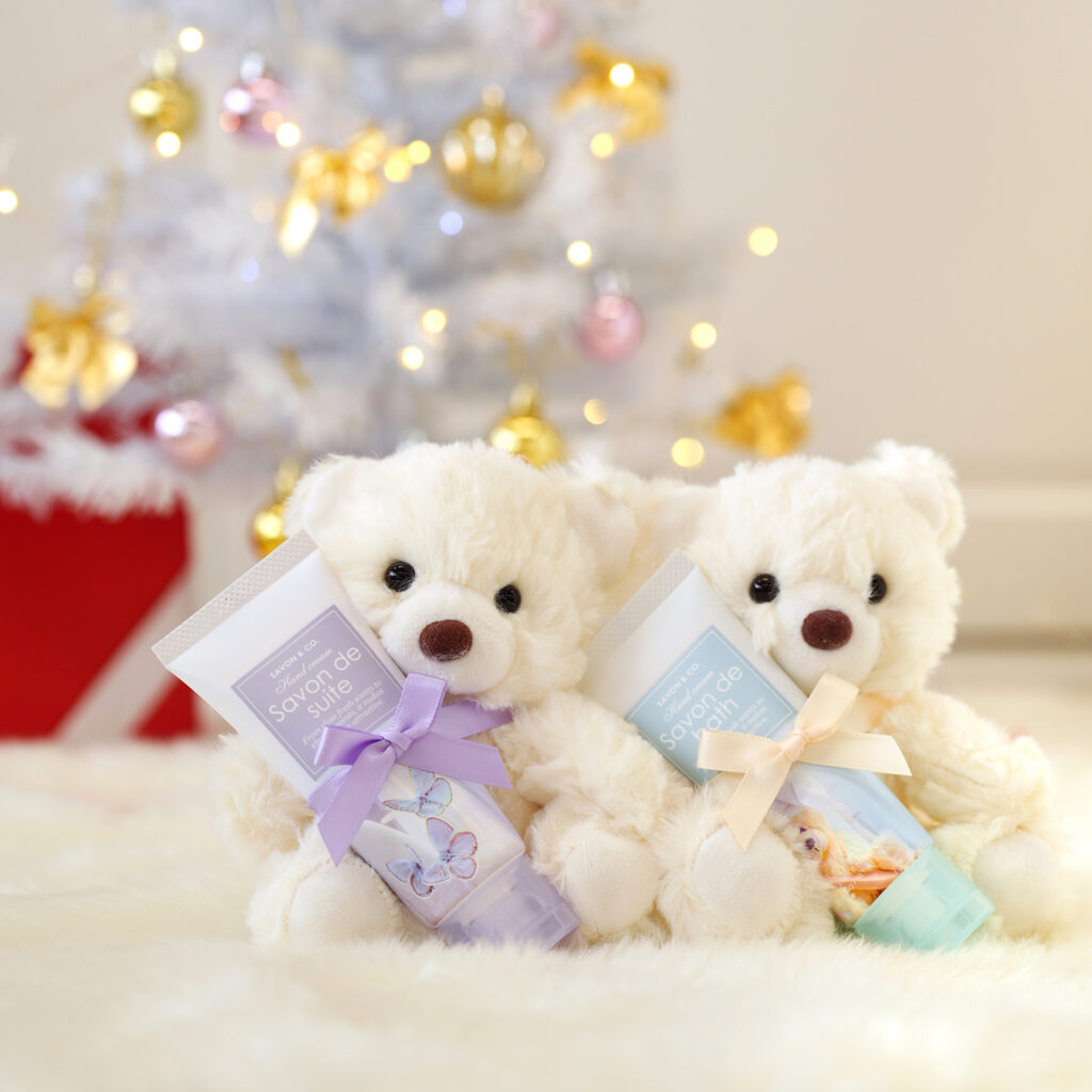 サヴォンアンドカンパニーのホリデーギフトはふわっふわで愛らしい瞳のチャーム付きベアと石鹸の香りのハンドクリームセット。